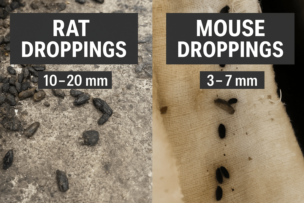 Check droppings first: mouse droppings are 3–7mm and pointed, while rat droppings are 10–20mm and blunt. Rats are also noisier and leave stronger smells.
